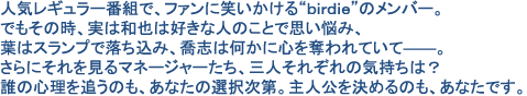 トップアイドルとして活躍するダンスユニット、「birdie」。 彼らは4年前、アイドルグループをプロデュースする企画のオーディションで選ばれた、中條和也・神沢喬志・小野塚葉の3人をメンバーとして結成され、デビューしたあとはたちまちトップアイドルの座を手に入れた。 デビューして3年少々。彼らはダンスに長けたアイドルグループとしてデビューしたが、歌って踊るだけでなく、バラエティ番組を持つなど、現在もグループとして活発な活動をしている。